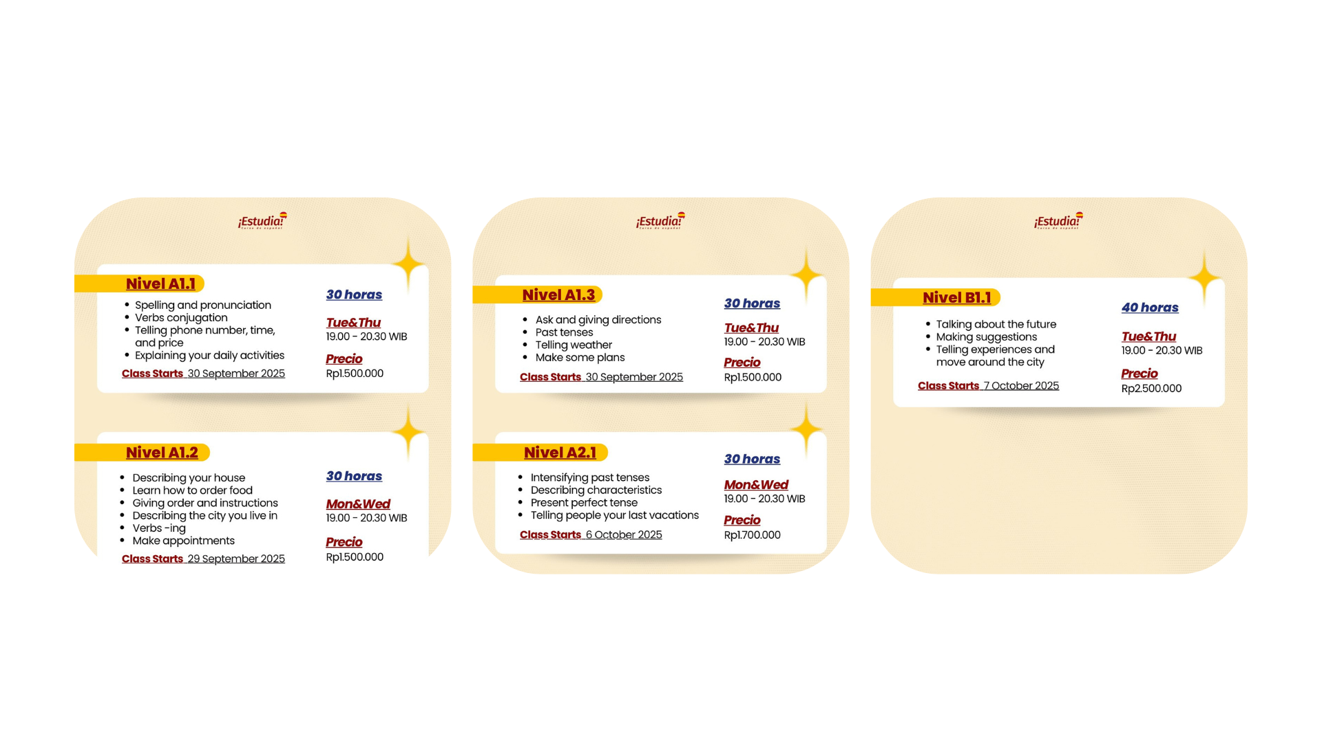Chicos juga bisa loh buat WA tanya-tanya ke Mindia terkait kelas lain dari Estudia Course. Selalu ada kelas private yang dibuka untuk siapa saja dan kapan saja.