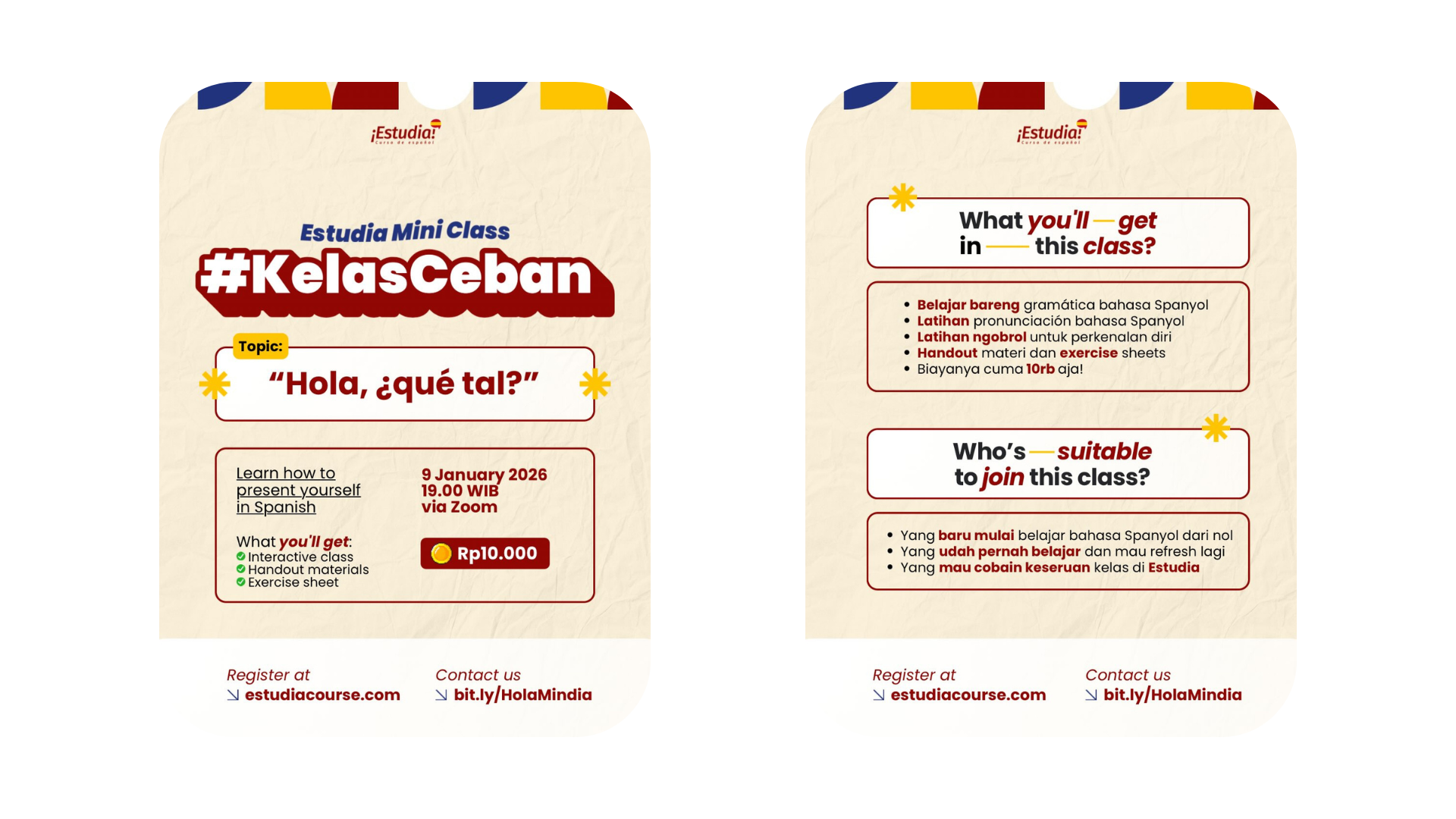 Chicos juga bisa loh buat WA tanya-tanya ke Mindia terkait kelas lain dari Estudia Course. Selalu ada kelas private yang dibuka untuk siapa saja dan kapan saja.
